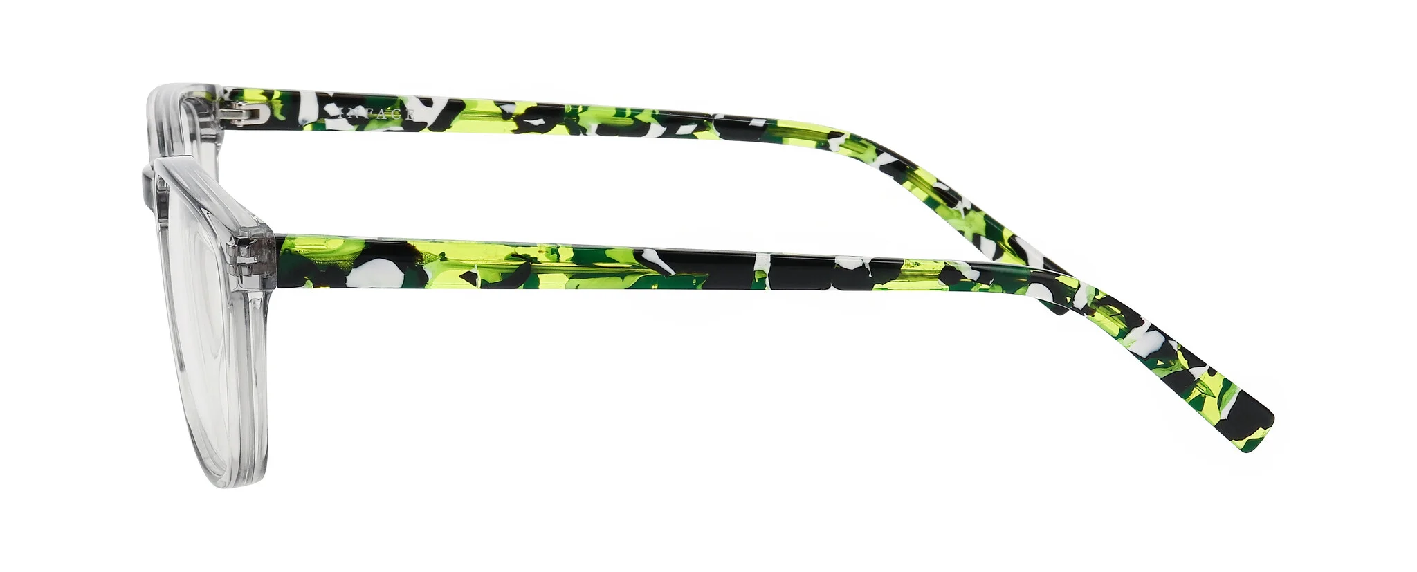 Choose from four striking colors, each featuring fun patterns and depth, from the transparent grey with wild green demi temples to the bold grey camo stripe.